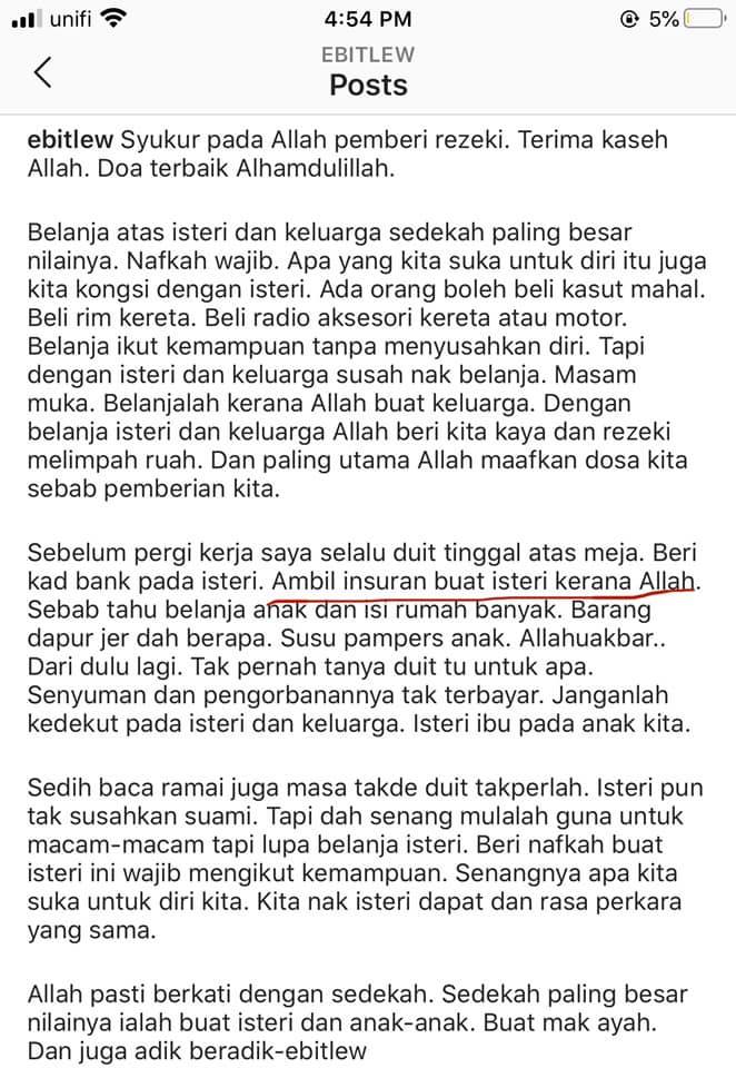 Tanda Ustaz Ebit Lew bersyukur pada Allah dan sayangkan isterinya, beliau mengambil insuran Takaful buat isteri tercinta.