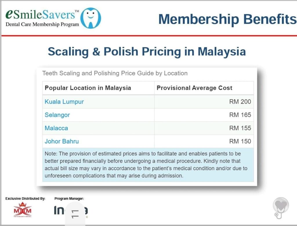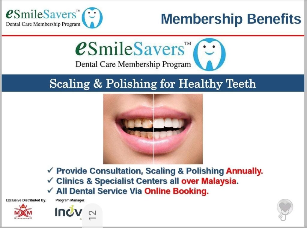 eSmileSavers Dental Care Membership Program Insurance Gigi Let MediSavers eSmileSavers look after your dental consultation, polishing and scaling annually!🦷A through cleaning and removal of all traces of plaque and tartar on your teeth that cannot be removed by brushing.Teeth scalling and polishing is commonly used to treat the following diseases / condition :Plaque on teeth, stained teeth, cavities (tooth decay), tooth damage, tooth infection & tartarPM for more info BUATKAN SAYA QUOTATION