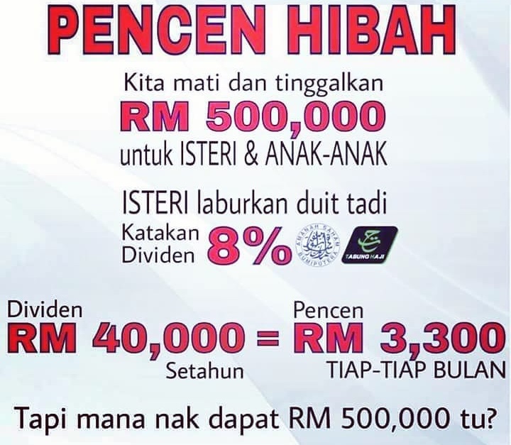 Oleh itu, dengan adanya dividen tahunan yang konsisten setiap tahun, keluarga anda boleh meneruskan kehidupan seperti biasa. Isteri yang dulunya seorang suri rumah tidak perlu keluar berkerja sebaliknya boleh memberi perhatian yang sepenuhnya untuk menguruskan anak-anak.